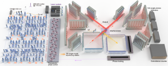 2021年,团队在“九章”的基础上,进行了一系列概念和技术创新。受到激光—“受激辐射光放大”概念的启发,研究人员设计并实现了受激双模量子压缩光源,显著提高了量子光源的产率、品质和收集效率。其次,通过三维集成和收集光路的紧凑设计,多光子量子干涉线路增加到了144维度。由此,“九章二号”探测到的光子数增加到了113个,输出态空间维度达到了1043。进一步地,通过动态调节压缩光的相位,研究人员实现了对高斯玻色取样矩阵的重新配置,演示了“九章二号”可用于求解不同参数数学问题的编程能力。根据目前已正式发表的最优化经典算法,“九章二号”在高斯玻色取样这个问题上的处理速度比最快的超级计算机快亿亿亿倍。