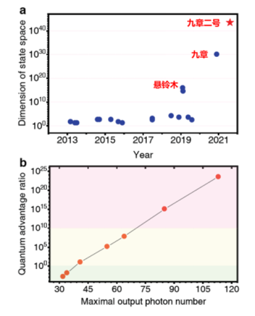 图3.论文数据图。a图表示输出态空间的维度。b图表示光量子计算原型机相比超算的优势倍数
