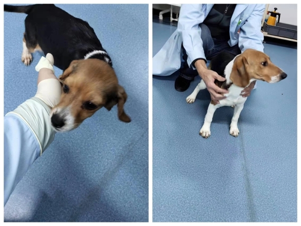 注射外源胰岛素治疗永久性新生儿糖尿病模型犬,左边纯合突变体,右边嵌合突变体