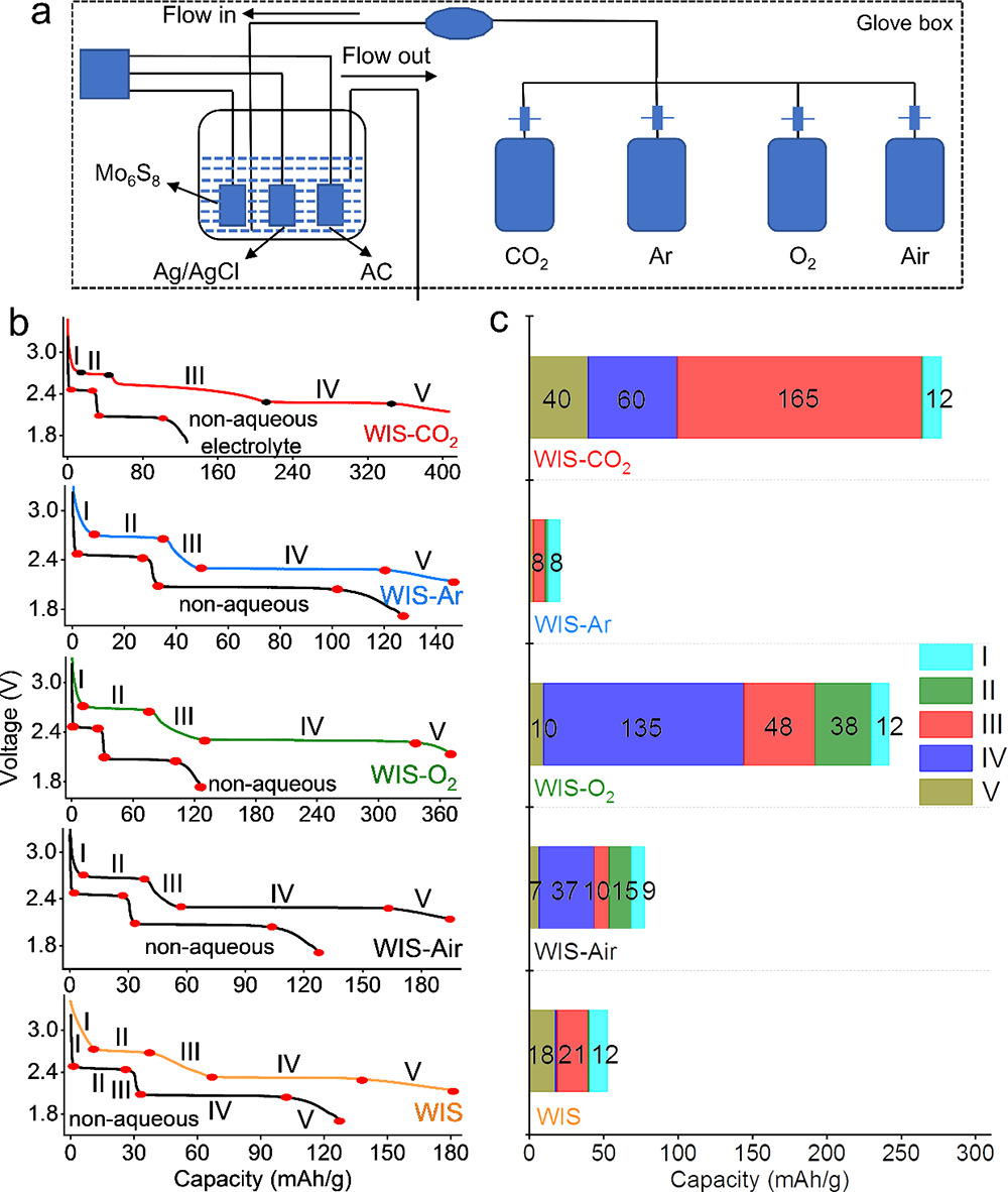 图1.不同气体氛围下WIS电解液中首周放电容量的定量分析。(a)三电极装置工作环境示意图,其中AC代表活性炭;(b)三电极装置下,Mo6S8在不同气体处理后的WIS电解液中的首周放电曲线,其中Mo6S8在有机体系扣式电池中的首周放电曲线用作对比;(c)与Mo6S8在有机体系中的结果相比,不同放电阶段气体还原贡献的容量