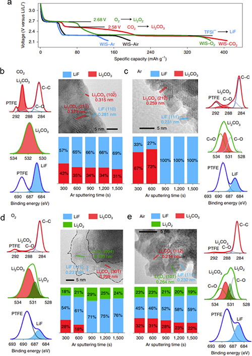图2.三电极装置下,Mo6S8在不同气体氛围下的WIS电解液中所形成的固态电解质界面SEI膜的成分分析。(a)三电极装置下,Mo6S8在不同气体处理后的WIS电解液中的首周放电曲线汇总。XPS及Ar离子刻蚀后的XPS联合TEM的结果来表征不同气体氛围下WIS电解液中循环后的Mo6S8的界面化学及结构;(b)CO2;(c)Ar;(d)O2;(e)Air