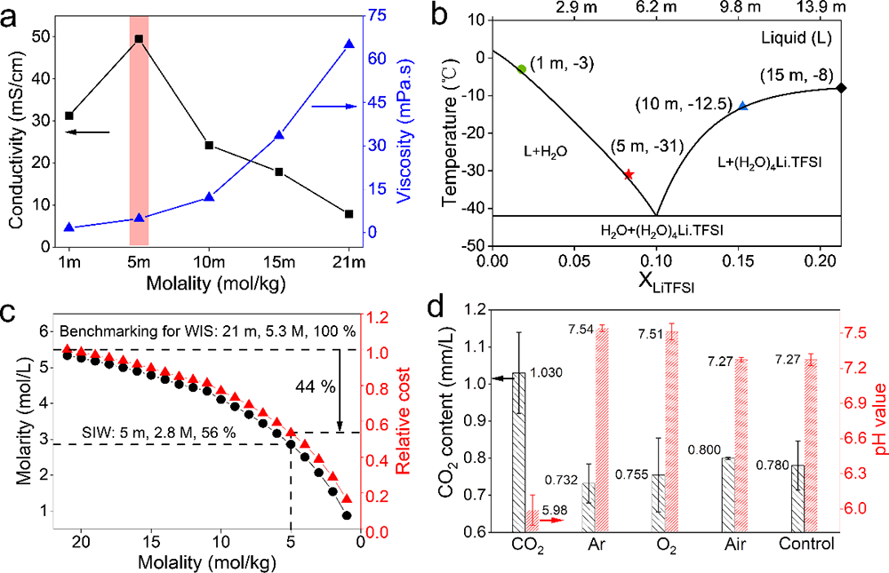 图3.5 m LiTFSI溶液的物理化学性质。(a)LiTFSI水溶液电导率和黏度随浓度的变化,正如粉红色阴影所展示的,5 m表现出最高的电导率和最小的黏度;(b)依据1 m,5 m,10 m和15 m的DSC结果给出的LiTFSI-H2O的两相分布相图,5 m具有更低的液相点温度(-31 ℃);(c)由21 m到1 m溶液成本的变化趋势以及M(mol/L)与m(mol/kg)的对应关系;(d)不同气体处理后5 m LiTFSI溶液的CO2含量及pH的对比,control是指没有处理过的5 m LiTFSI溶液,所有样品都测试了三次以求取平均值,相应的标准偏差以误差条的形式给出