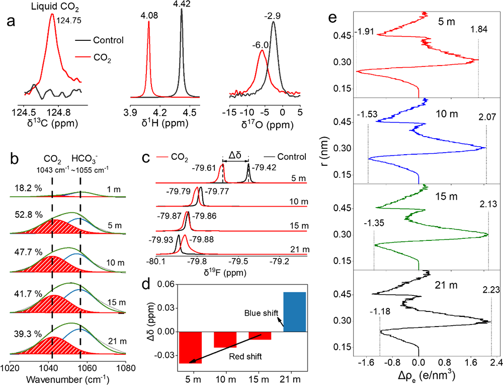 图4.CO2气体处理前后CO2与TFSI阴离子的相互作用。(a)CO2处理前后5 m LiTFSI溶液的13C,1H和17O核磁共振谱;(b)不同浓度电解液用CO2气体处理后的红外光谱对比;(c)不同浓度LiTFSI 电解液用CO2气体处理前后19F的NMR化学位移对比;(d)给出了(c)中相应的偏移值;(e)TFSI阴离子中F元素周围电子云密度变化的分子动力学模拟分析(Δρe = ρe,CO2-dealt - ρe,CO2-control);(c-e)的结果显示CO2与TFSI阴离子之间具有较强的相互作用
