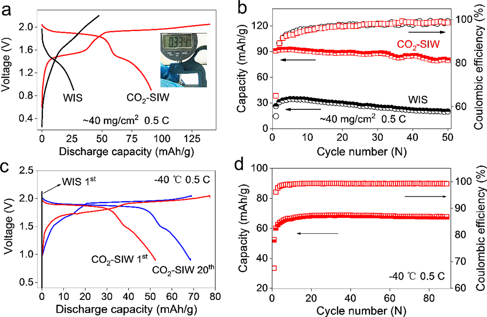 图6.CO2-SIW电解液和WIS电解液下LiMn2O4-Mo6S8全电池的动力学性能,LiMn2O4与Mo6S8的质量比为2:1,比容量的计算是依据Mo6S8负极的质量来计算的。厚电极(40 mg/cm2,300 μm)下的。(a)首周充放电曲线以及(b)循环性能;低温(-40 ℃)下的(c)首周充放电曲线以及(d)循环性能