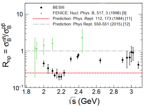 图1.正负电子对湮灭到中子-反中子对的产生截面与质子-反质子对的产生截面的比值