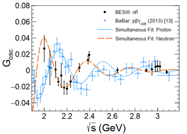 此外,实验团队还观测到中子电磁形状因子分布中的一个周期性振荡结构,如图2所示。该振荡分析受到另一项基于BaBar实验结果的启发。不同之处在于质子的电磁形状因子围绕修改的偶极分布振荡,而中子的则围绕偶极分布振荡。若假设振荡频率相同,振荡相位接近正交。该振荡结构揭示了核子内部存在未理解的动力学机制,可能的解释包括末态散射效应以及与共振态的干涉等。上述结果是理解核子电磁形状因子的重要研究进展。