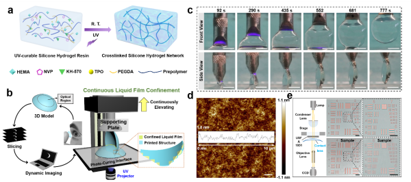近日,该课题组提出了一种基于数字光处理(DLP)技术的连续液膜限制的3D打印策略,消除了逐层打印过程中出现的台阶效应,实现了高精度3D结构的制备。在连续打印过程中,附着在固化结构外的液膜始终受到固-液界面的限制。该液体树脂-固化结构界面的限制作用增强了未固化的液体树脂吸入并填充于相邻图案层之间的间隙,以消除台阶效应;亦可作为液体刮刀刮除固化结构外包覆的多余树脂,以实现高保真打印。由于粘附的液膜是作为过渡层而不是传统上认为的液体树脂残余物,因而避免了后清洗步骤。研究优化墨水性质和打印参数,可较好地控制3D打印隐形眼镜结构的液膜厚度和表面光滑度。此外,该技术还可以抑制热累积和热扩散,确保连续打印过程的稳定性。基于这一打印策略,科研人员制备出具有极高的光滑度(均方根粗糙度小于1.3 nm)、均匀的机械性能、良好的生物相容性以及高光学质量(透光性和光学分辨率达96%和228.1 lp/mm)的隐形眼镜结构。