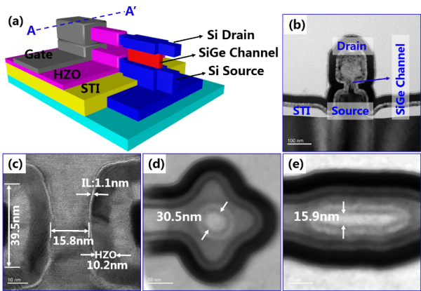 (a)Fe-VSAFET器件结构图;(b)-(e)Fe-VSAFET的TEM顶视和截面图