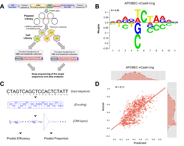 为评估GBE在多个位点的编辑情况,提高其应用潜力,研究人员运用高通量细胞建模技术,在哺乳动物细胞中进行6400多个基因组靶点的GBE编辑,建立了人工智能AI机器学习模型。研究将收集到的数据用于AI训练,得到了预测碱基编辑效率和结果比例的模型。同时,研究基于获得的序列基序,设计出具有高编辑效率的GBE gRNA,且在293T和HeLa两种细胞中证实了GBE机器学习模型可近似预测任意给定GBE gRNA的编辑结果。此外,科研人员利用该模型预测人类疾病相关点突变的建模和校正的编辑结果,提出一系列具有高预测编辑效率的SNP,进一步为单碱基突变引起的疾病的治疗带来希望。该工作克服了GBE技术的序列依赖问题,显著提高其应用能力。