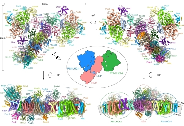 光合作用光反应过程是在一系列镶嵌在光合膜上的蛋白质超分子机器中进行的,通过光驱动光系统II(PSII)和光系统I(PSI)反应中心电荷分离及光合电子传递,将光能转化为化学能(ATP和NADPH),用于暗反应二氧化碳固定。PSI和PSII催化两种类型光合电子传递,分别为线性电子传递和环式电子传递。在环式电子传递路径中,由NDH蛋白复合物介导的围绕PSI的环式电子传递是主要路径之一,该路径对维持光合固碳过程中ATP的供应及逆境胁迫条件下类囊体膜基质氧化还原状态具有重要功能,此前对于该路径中的关键超大膜蛋白复合物PSI-NDH结构和调控机制的认识尚不清楚。