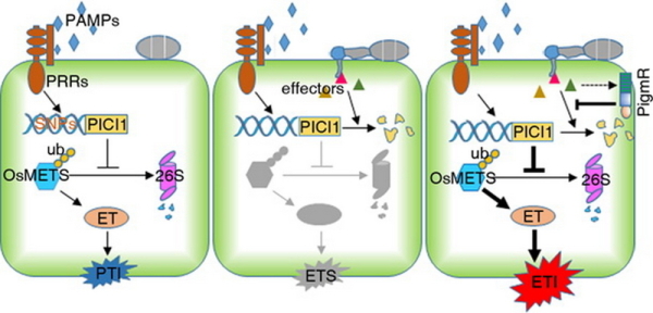 针对以上问题,课题组综合利用植物病理学、蛋白组学、遗传学、分子和生化等实验技术平台,鉴定到新的免疫调控蛋白PICI1,随后发现PICI1作为植物中一类新的去泛素化蛋白酶发挥功能。进一步地,研究人员通过遗传、生化、生理、病理等实验鉴定到PICI1的直接下游底物—蛋氨酸合酶OsMETS,并发现PICI1可以通过降低OsMETS的泛素化水平增强其蛋白稳定性,促进蛋氨酸-乙烯代谢通路,进而激活水稻的免疫反应。至此,研究揭示出一条全新的免疫代谢调控通路(PICI1-OsMETS-ethylene),并且该通路既参与水稻的基础抗病性(PTI)又调控NLR介导的专化型抗病性(ETI)。研究还发现,病原菌可以通过分泌一些毒性蛋白直接降解PICI1,抑制水稻的基础抗病性(PTI)。然而,植物与病原菌长期处于类似于“军备竞赛”的协同进化中,水稻产生的广谱抗病NLR类受体PigmR等通过竞争性抑制病原菌毒性蛋白与PICI1的互作,保护并加强PICI1-OsMETS-乙烯代谢通路,从而激发更强烈的ETI抗性。这是一个新的植物与病原菌“军备竞赛”的互作研究范例,首次回答了植物在与病原菌协同进化过程中,如何通过增强防卫代谢以获得广谱抗病性的科学问题,并从基础代谢的角度揭示了水稻NLR受体介导的专化性抗病性依赖于基础抗病性的保守机制,为水稻及农作物的抗病育种设计奠定了理论基础。