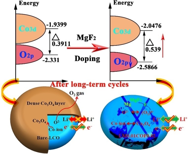 近日,中国科学院大学材料科学与光电技术学院教授刘向峰团队利用中子衍射、同步辐射吸收谱、共振非弹性X射线散射、微分电化学质谱、高角环形暗场扫描透射电子显微镜及DFT计算等,首次发现表面氧逃逸及其诱导形成的Li绝缘体Co3O4是造成4.6V高电压LiCoO2容量衰减的根本原因,提出“调控Co3d和O2p能带中心抑制氧逃逸和Co3O4形成的新策略”,实现了4.6V高电压LiCoO2正极材料的稳定循环。