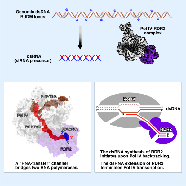 近期,中国科学院分子植物科学卓越创新中心张余研究团队、王佳伟研究团队以及浙江大学冯钰团队合作,首次解析了植物Pol IV的结构,揭示了植物Pol IV-RDR2两种RNA聚合酶组装成的独特复合物构造,并提出了Pol IV-RDR2以底物内部传递的机制实现双链DNA为模板合成双链RNA。