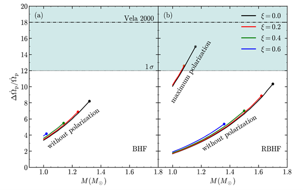 研究基于微观方法Brueckner和相对论Brueckner多体理论方法,以现实核力为基本输入,对中子星物质进行第一性原理计算,获得了物态方程(包括质子丰度与压强能量的密度依赖关系)。科研人员通过得到的物态对星体结构进行描述,并结合两分量模型,探究船帆座(Vela)脉冲星2000年跃变的跃变幅度和跃变约1分钟后的短期恢复观测数据,发现跃变观测支持船帆座脉冲星是一颗小质量的中子星,典型半径约为12.5千米,且中子的超流能隙受核介质的极化程度影响较大。