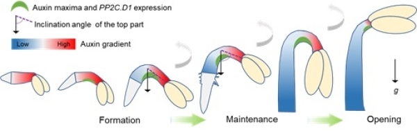 研究发现,在幼苗发育的早期,与传统认为“生长素促进地上部分(shoot)细胞生长”的观点不同,下胚轴中高浓度的生长素抑制细胞生长。随着下胚轴细胞的快速生长和体积变大,高浓度的生长素逐渐被稀释到相对较低的浓度,转而促进细胞生长。这种生长素介导的由抑制转为促进的生长调控使得下胚轴经历两个不同的伸长阶段,即早期速度慢而晚期速度快。早期的慢速生长恰好为顶端弯钩的形成提供了发育窗口。后续研究表明,重力是触发幼苗顶端弯钩形成的起始信号。在生长素抑制细胞生长的早期慢速生长阶段,重力诱导高浓度生长素在下胚轴的下侧(靠近地面一侧)积累,导致该侧细胞的生长抑制得以加强,而另一侧的生长抑制得以缓解。因此,此时的下胚轴像根一样具有正重力反应而向下弯曲生长,进而启动弯钩的形成(如图)。进一步地,随着下胚轴细胞由基向顶快速生长,底部细胞先于顶部细胞生长变大,使得细胞内的生长素浓度先于顶部细胞被稀释到相对较低的浓度(低于生长抑制的阈值)。生长素浓度的降低导致其对细胞生长的调控作用由抑制转变为促进,相应地,下胚轴底部的重力反应也由正变负转而向上直立生长(如图)。与此同时,顶部细胞因仍具有较高的生长素浓度而保持正重力反应向下弯曲(顶端弯钩)。随着越来越多的下胚轴细胞由基向顶地转入直立向上的生长阶段(负重力反应),顶端弯钩获得快速向上的动力,最终帮助幼苗破土而出。