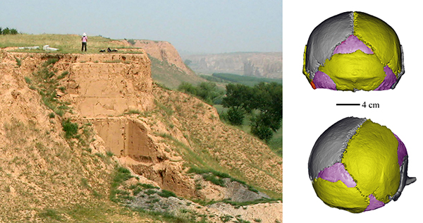 图1.许家窑人遗址(左)及其发现的古人类化石复原头骨(右)