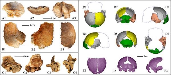 图2.许家窑人头骨化石碎片及其复原的头骨和颅内模(吴秀杰供图)。A1-3:PA1486,枕骨外侧面、顶面和内侧面观;B1-3:PA1490,右侧顶骨外侧面、内侧面和顶面观;C1-4:PA 1498,左侧颞骨外面、近中面、侧面和下面观;D1-6:3D虚拟复原头骨的顶面、前面、左侧面、右侧面、后面和下面观;E1-3:3D虚拟复原颅内模顶面、后面和右侧面观。