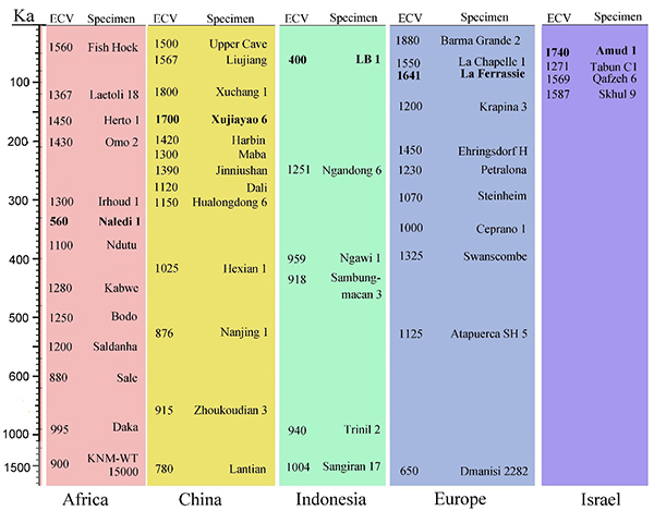 图3.更新世部分古人类颅容量随地质年代变异的地区间比较(吴秀杰供图)