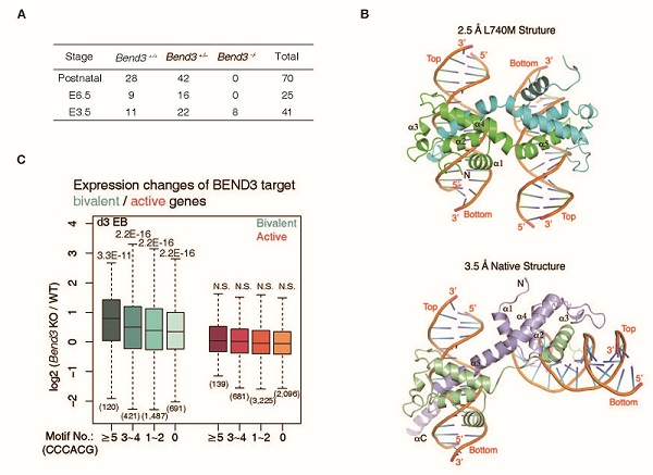 本研究中,科研人员发现BEND3能够特异性结合在基因组中含有CpG岛的活跃基因和二价基因的启动子区域,并找到了BEND3特异性结合的DNA基序。通过与许瑞明组合作,研究解析了最关键的第四个BEN结构域结合DNA基序的共结晶结构,为BEND3序列特异性和DNA甲基化敏感结合特性提供了结构依据。利用小鼠模型,研究发现Bend3敲除的小鼠胚胎会在原肠胚形成阶段死亡。体内畸胎瘤形成实验和体外分化实验证明了Bend3敲除的小鼠胚胎干细胞虽然能够保持自我更新,但丧失了分化的能力。为了找到发育和分化缺陷的分子机制,研究利用体外类胚体分化(EB分化)实验,结合RNA-seq技术,发现数百个被BEND3高度占据的二价基因在分化早期被异常激活。结合各种全基因组学分析研究发现,Bend3敲除导致一部分富含BEND3的二价基因启动子上SUZ12和H3K27me3水平的下降,致使这些失去PRC2和H3K27me3保护的二价基因在分化过程中在不恰当的时间被错误地提前激活,最终导致发育和分化的失败。