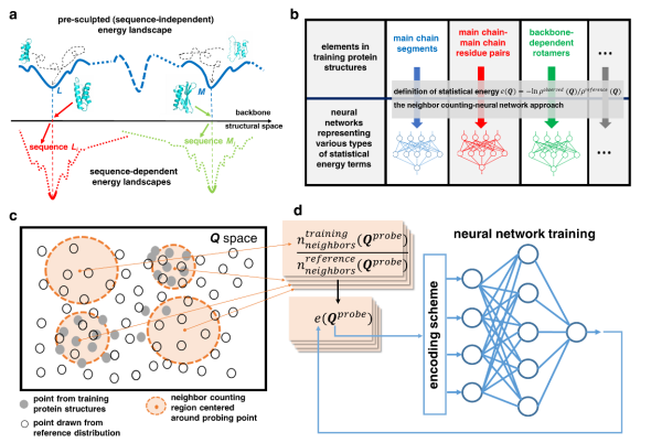 用SCUBA模型进行蛋白质设计的原理。a:SCUBA主链能量面上的极小对应了蛋白质的可设计主链结构,即特定氨基酸序列下的最低自由能结构;b:SCUBA中用神经网络表示的统计能量项;c、d:用近邻计数(NC)-神经网络(NN)方法从蛋白质结构原始数据中学习解析能量函数的方法框架