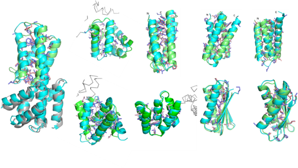 从头设计蛋白的高分辨晶体结构(天蓝色)与设计模型(绿色)比较