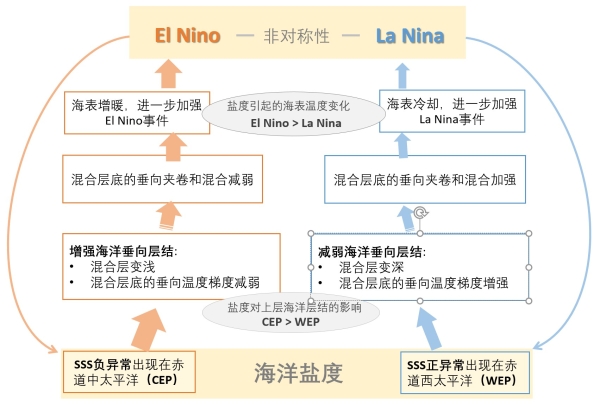 厄尔尼诺-南方涛动(ENSO)对全球气候系统具有非常重要的影响,其冷暖位相非对称性等复杂性特征和机理,是物理海洋和气候学领域的热点研究方向。经过几十年的研究,人们从大气-海洋动力学角度基本建立了ENSO的理论框架。然而,近年来却发现气候模式对ENSO的预测能力并未随时间持续提高,其中一个重要原因是对ENSO复杂性的理解和认识仍有不足。海洋盐度是影响ENSO循环的一个独具特色的因子,可以通过影响海洋层结和热障效应促进ENSO事件的发展,然其在ENSO非对称性中的作用仍不清楚。