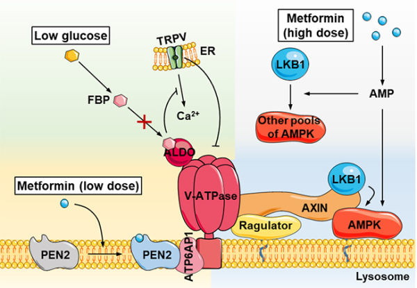 近日,中国科学院大连化学物理研究所中科院分离分析化学重点实验室生物分子功能与机制研究组研究员朴海龙团队,与中科院院士、厦门大学教授林圣彩团队/教授邓贤明团队合作,鉴定到二甲双胍直接作用的分子靶点为PEN2(γ-secretase的亚基),并进一步揭示了这一分子间的相互作用介导的溶酶体途径,激活AMPK的具体方式,阐释了AMPK相关途径在二甲双胍所介导的降糖、延长寿命和延缓衰老等功能上的重要作用。