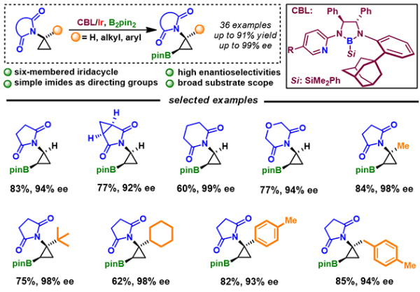 近期,中国科学院兰州化学物理研究所羰基合成与选择氧化国家重点实验室有机硼催化组徐森苗团队针对环丙胺碳氢活化中缺乏合适导向基、易开环、存在竞争性反应等问题,利用金刚烷取代的CBL,首次实现以简单环状酰亚胺为导向基,环丙胺类化合物的高对映选择性C(sp3)-H键硼化反应,产物的最高ee值可达99% 。该反应具有非常广谱的底物兼容性(36个例子),所获得的硼化产物可发生一系列的转化反应,并可实现生物活性分子的合成。