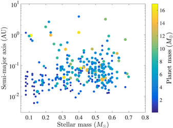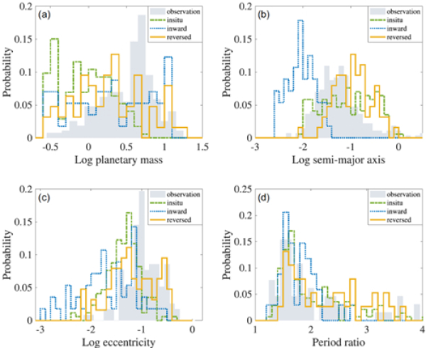 研究团队进一步揭示了红矮星系统中类地行星的生成率,例如原位形成模型中可平均生成7.77个质量约为1.23 M⊕(M⊕为地球质量)的行星,向内迁移与反向迁移机制可分别平均产生2.55个质量约为3.76M⊕和2.85个质量约为3.01M⊕的行星。研究人员从行星质量、轨道半长径和偏心率分布等方面将模拟结果和实际观测样本进行分析对比,发现反向迁移机制形成的行星分布与观测数据具有较高的吻合度,揭示了红矮星周围宜居类地行星可能的形成机制。