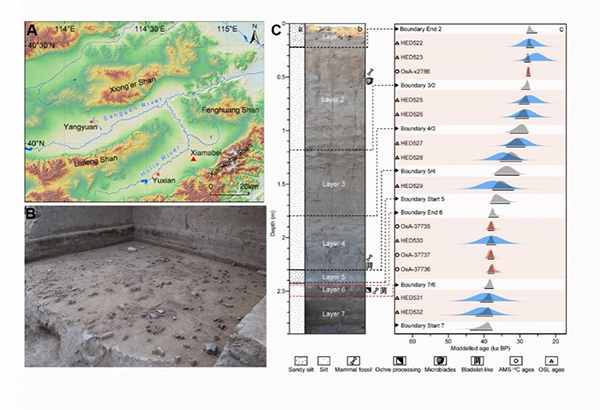 图1.下马碑遗址的位置、地层与年代。A、下马碑遗址在泥河湾盆地中的位置,B、下马碑遗址主文化层(#6)发掘面,C、遗址地层剖面及测年结果。(研究团队供图)
