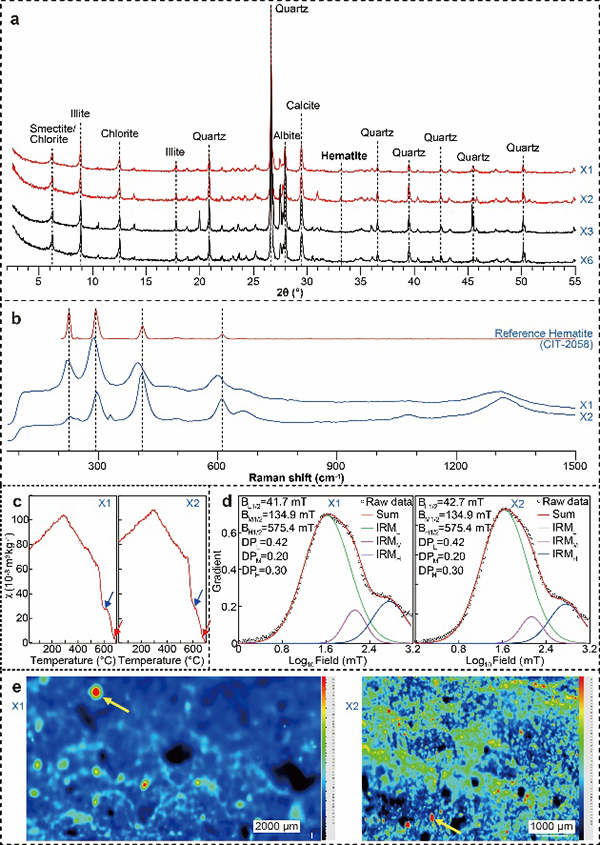 图3.染色区及遗址内其他区域沉积物的矿物学特征对比。样品X1和X2来自染色区,X3和X4来自非染色区。a、X射线衍射(XRD)分析结果,b、拉曼光谱分析结果,c、磁化率随温度变化特征,d、矫顽力谱分析结果,e、微束X射线荧光光谱(microXRF)分析结果。上述多指标分析揭示出,染色区沉积物含有大量粗颗粒赤铁矿,结合考古学证据可以确定,这些粗颗粒赤铁矿为人类加工颜料过程中产生的遗存。(研究团队提供)