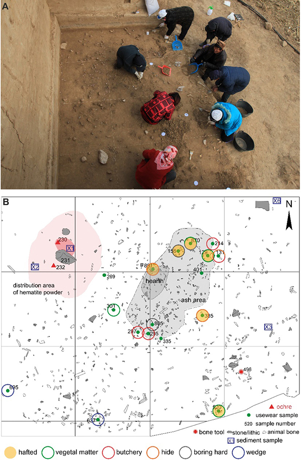 图5.遗址位置、周边景观及地层。A:遗址野外发掘照,B:遗迹、遗物平面分布情况(含石器功能信息)。(研究团队提供)