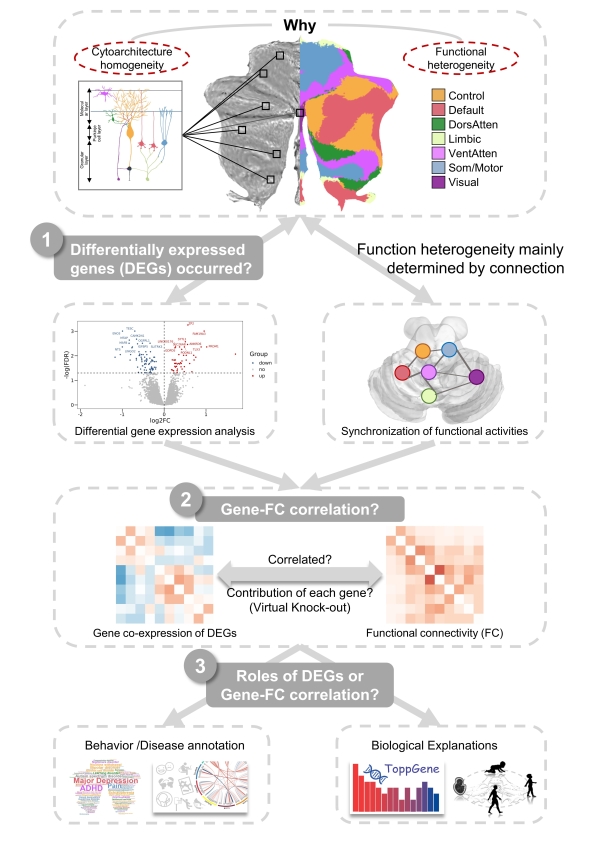 目前,相较于对人类大脑功能组织模式的认识,科学家对功能分离和功能整合之间的关系在人类小脑中如何表征和交互的仍知之甚少。人类小脑虽然体积小,仅占整个人脑体积的十分之一,但却包含了整个脑部50%以上的神经细胞。在过去两百多年里,小脑区域被认为只在运动任务和感觉信息处理中发挥作用。现在,越来越多的研究发现它还参与到了情绪、语言、记忆等高级认知功能中。同时,大量的研究也发现小脑的改变也与包括自闭症、抑郁症、精神分裂症等在内的多种精神障碍相关。关于人类小脑的一个有趣的悖论是小脑皮层的细胞构筑近乎同质与其复杂的功能异质性之间的不一致。细胞构筑高度同质的不同小脑区域是如何参与功能分离的呢?不同于大脑皮层,人类小脑的功能多样性更多地取决于小脑与小脑外结构的广泛相互连接,而非其高度均一的细胞构筑。既然普遍认为人类神经系统的宏观功能组织是由潜在的微观基因表达调节的,那么小脑这种独特的内在功能组织模式是否也是由基因调控的呢?如果有遗传基础,又是通过什么样的机制进行运作的?至今,这些问题还未被系统地研究和回答。