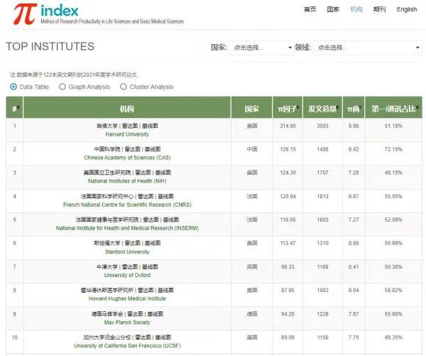 3月14日,中国科学院上海营养与健康研究所生命健康科技智库发布了“生命科学与基础医学全球科研机构产出评价暨2022π指数年度报告”。2022π指数年度报告的数据来源是2021年发表在122种期刊上的研究型论文。报告主要内容包括全球论文量TOP10国家/地区,全球π因子TOP10与π商TOP10机构,全球π因子TOP500机构,中科院下属π因子TOP10机构以及美国、中国、英国、德国、法国等全球论文量TOP10国家π因子TOP20—TOP100机构分布情况等。