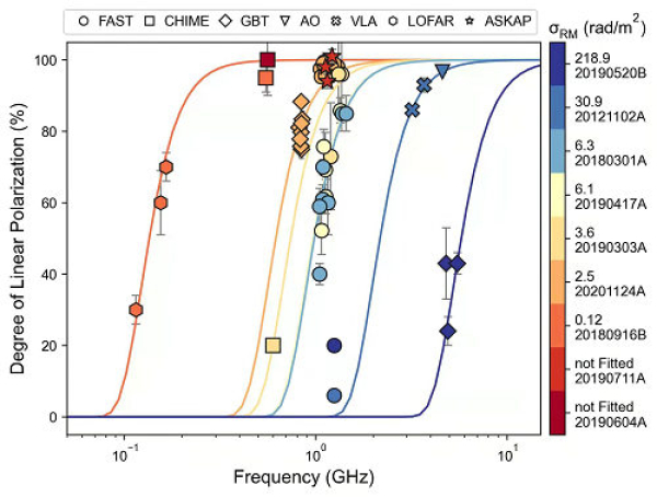 图1.重复快速射电暴偏振频率演化关系。不同颜色的线代表不同的快速射电暴的偏振随频率演化关系曲线,每条线仅用一个参数“RM弥散(σRM)”拟合。σRM越大代表快速射电暴所处的环境越复杂,其所处的演化阶段极为可能越早,和超新星遗迹等爆发类现象的特征更为吻合。