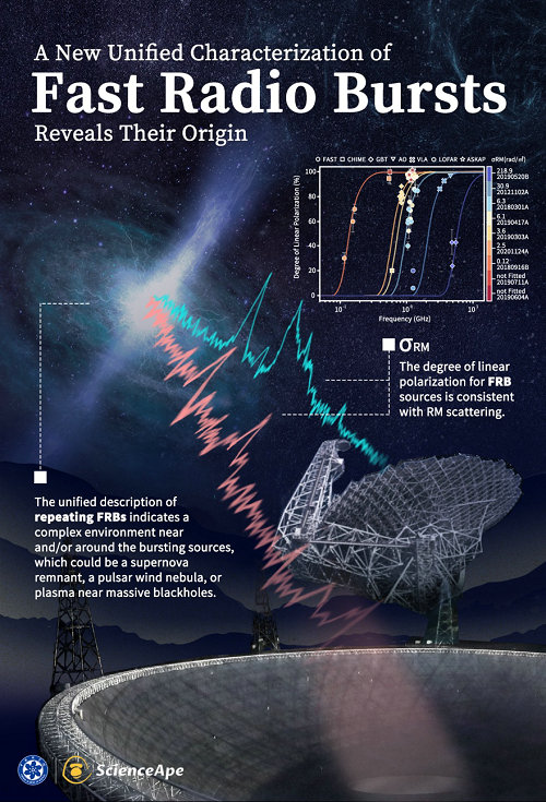 快速射电暴(FRB)是在无线电波段最为剧烈的爆发现象,其起源未知,也是当今天文学领域热点前沿之一。中国科学院国家天文台李菂团队系统分析了来自包括“中国天眼”500米口径球面射电望远镜(FAST)、美国绿岸望远镜(GBT)在内的多项数据,首次提出了能够统一解释重复快速射电暴偏振频率演化的机制,并基于此导出了能够描述快速射电暴周边环境单一参数即“RM弥散”。这一机制支持重复快速射电暴处在类似超新星遗迹的复杂电离环境中,并可以通过偏振观测确定其可能的演化阶段,为最终确定FRB起源提供了关键观测证据。快速射电暴的“RM弥散”越大对应其周边环境变化越剧烈,因此也很可能越年轻,这有潜力成为辨识重复暴的“身份证”。北京时间3月18日,相关研究成果发表在《科学》(Science)上。