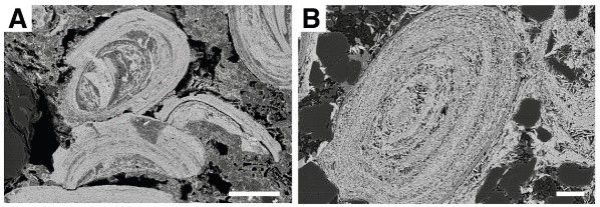 图1.元古宙GIF的背散射图像。A、~1880 Ma Gilbralter组中多种赤铁矿鲕粒形态,可见碎片状的鲕粒,说明沉积过程中的扰动再造;B、~750 Ma Galeros组中赤铁矿鲕粒和胶结的石英颗粒。比例尺为100 μm