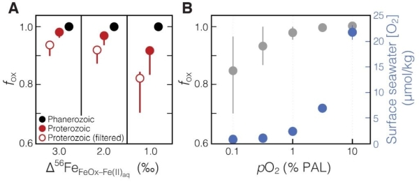 图3.基于铁同位素分馏机制的元古宙和显生宙GIF或铁岩的铁氧化模型。A、瑞利分馏模型,显示元古宙和显生宙IF不同的铁氧化程度;B、铁氧化的动力学模型,涉及特定范围内的酸碱度和温度背景值。基于水-气交换平衡,可同时估算表层海水和大气氧含量