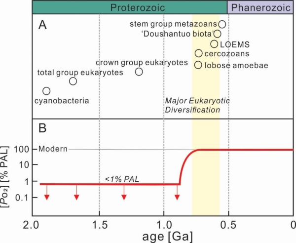 地球的充氧历史是漫长复杂的过程。大气氧含量经历了元古宙早期(大氧化事件,2.45-2.2 Ga)和晚期(新元古代氧化事件,0.63-0.54 Ga)两个阶段的提升才接近现今氧水平(PAL)。早期生命在该过程中完成了从原核生物到真核生物再到动物的进阶演变。长期以来,地球表生环境与生命演化之间的内在因果联系是研究的热点与焦点。