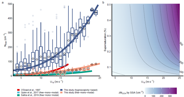 为此,爱尔兰国立高威大学教授Colin O’Dowd团队与中国科学院地球环境研究所研究员黄汝锦团队利用海盐气溶胶超高吸湿性的特点,量化了SSA的粒径分布(35 nm-10 μm),进而揭示了SSA对海洋大气CCN的贡献。研究发现,SSA的数浓度被低估了1-3个数量级,因此SSA对海洋大气CCN的贡献也被低估了一倍以上。该工作首次明确了亚微米级SSA粒径分布与风速的通量方程,揭示了传统方法对SSA数浓度的严重低估(如图),纠正了SSA对海洋大气CCN贡献低的传统观点,为评估海-气界面物质交换及全球气候变化提供了可靠的参数化方案。