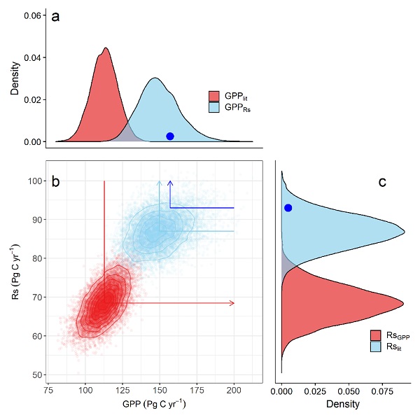 图1.a、基于遥感影像(红色)和基于土壤呼吸数据库(淡蓝色)估算得到的全球陆地植被初级生产力(GPP),b、全球初级生产力和土壤呼吸之间的关系散点图,c、基于遥感影像(红色)和基于土壤呼吸数据库(淡蓝色)估算得到的全球土壤呼吸量(RS)