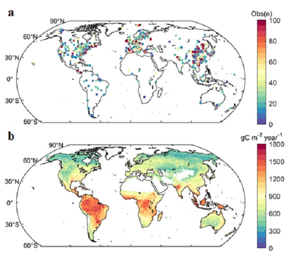 图2.基于月时间尺度的全球土壤呼吸数据,采用随机森林建模估算得到的全球土壤呼吸。a、随机森林模型中使用的土壤呼吸站点空间分布,b、随机森林模型预测得到的土壤呼吸全球空间分布