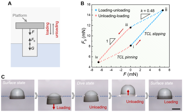 近日,宋延林研究团队发现在不同高度落入水中的物体,稳定后可以在水面上呈现不同浸没深度,从而表现出不同的漂浮状态(图1)。理论分析表明,由于固-液粘附作用,物体入水后的三相接触线表现出钉扎-滑移-钉扎的三阶段动力学行为,这是物体呈现不同漂浮状态的根本原因。据此,研究提出了“浮滞回线”来指导调节物体漂浮状态。研究发现,改变外力的加载-卸载顺序能够实现物体漂浮状态的调控(图2)。研究展示了可变漂浮状态在界面催化、液体蒸发和药物释放等领域的应用。该研究加深了科学家对漂浮过程中界面现象的理解,并在相关领域具有重要的启示意义。