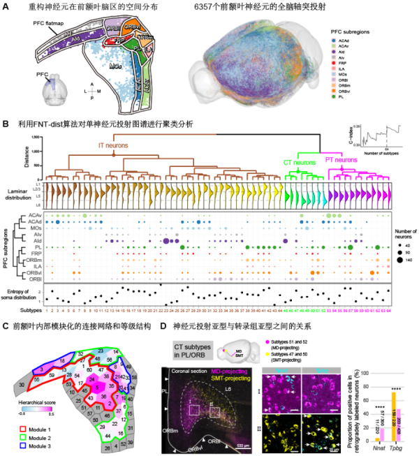 A、6357个前额叶单神经元在前额叶亚区的分布和全脑轴突形态;B、神经元形态学分类,64个前额叶投射神经元亚型在前额叶亚区和皮层深浅的分布;C、前额叶内部连接网络的模块化和等级结构;D、前额叶投射亚型与基因亚型的关系(CT皮层丘脑神经元在PL-ORB脑区)