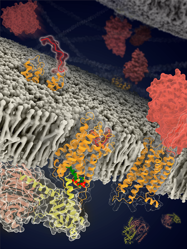 黏附类受体结构示意图。黏附类受体在细胞黏附和信号转导中发挥重要作用,是癌症和神经系统疾病等的潜在药物作用靶点。图中处于不同功能状态的ADGRF1结构或模型用橙色飘带图表示,受体中的stalk区域用红色表示,脂分子LPC用绿色表示,GAIN结构域为砖红色,G蛋白的三个亚基分别为黄色、浅粉色和浅灰色