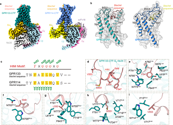 通过复合物冷冻电镜结构解析,研究发现了Stachel序列HIM结构介导其与受体相互作用。为探究Stachel序列与受体之间的作用关系,研究人员解析了GPR133-CTF-Gs-Nb35和GPR114-CTF-Gs-scFv16复合物的低温电镜结构,分辨率分别为3.1 埃和3.3 埃(图3a)。GPR133-CTF和GPR114-CTF的总体TMD排列与团队最近解析的黏附受体GPR97结构差别较大,更类似于分泌素样GPCR(ClassB1)结构,在TM6和TM7存在两个kink结构。GPR133-CTF和GPR114-CTF的Stachel序列均折叠在被跨膜螺旋和ECL2包围的正构结合位点口袋内,Stachel序列在口袋内部形成α螺旋结构(图3b)。Stachel序列中5个疏水氨基酸组成的保守HIM (Fss-03xφφφxφss-09)在Stachel序列与受体相互作用中起核心作用(图3c)。Fss-03, φss-06, φss-07三个氨基酸侧链朝向配体结合口袋内侧,φss-05侧链朝向口袋外侧,最后一位φss-09与TM5以及ECL2上的氨基酸形成一个疏水口袋(图3d-i)。