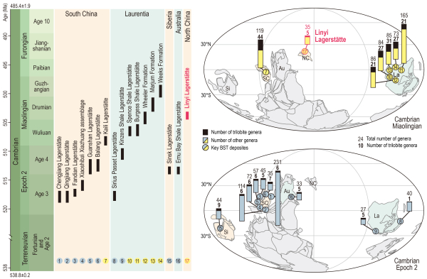 图1.16个主要的寒武纪特异埋藏化石库的时空分布和多样性,以及临沂动物群(Linyi Lagerstatte)在其中的位置