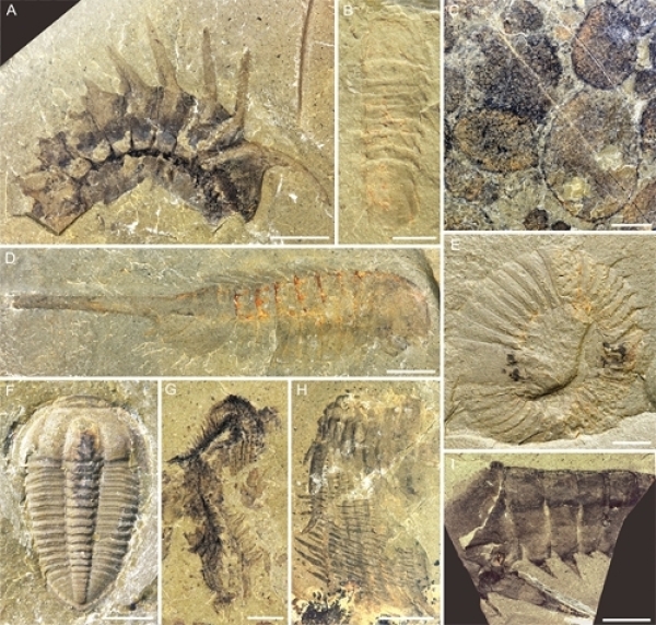 图2.临沂动物群中的代表性类群。A、刺迷音虫Thelxiope spinosa;B、对称莫里森虫Mollisonia symmetrica;C、群体的对角海绵Diagoniella;D、唐氏迷音虫Thelxiope tangi sp. nov;E、线纹心虾Cordaticaris striatus的口器;F、标准长清虫Changqingia puteata;G、未定的蠕虫状动物;H、线纹心虾Cordaticaris striatus的前附肢;I、抱怪虫类的前附肢