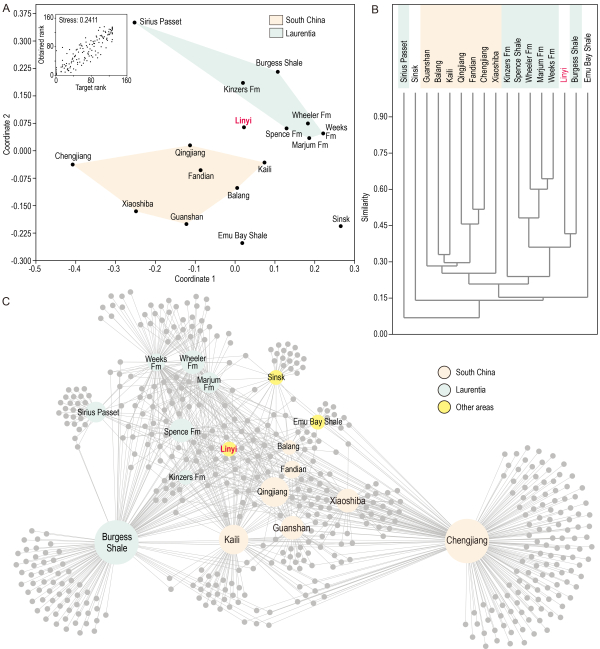 图3.非度量性多维标度变换(左上)聚类分析(右上)、网络分析(下)等定量分析手段识别的临沂动物群与全球16处经典寒武纪特异埋藏化石库之间的关系