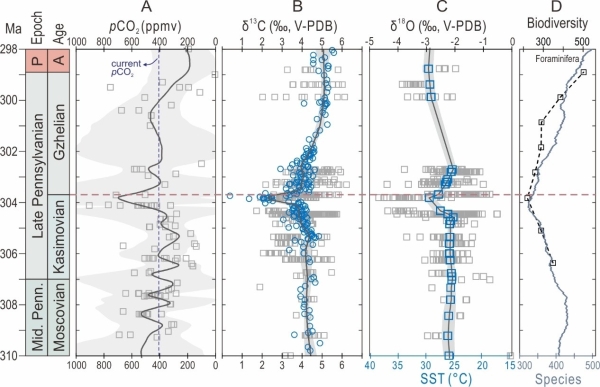 图1.石炭纪晚期(约304百万年)发生的一次显著的大气二氧化碳浓度升高及碳同位素负漂事件,对应着全球海水表层温度升高及海洋生物多样性的降低